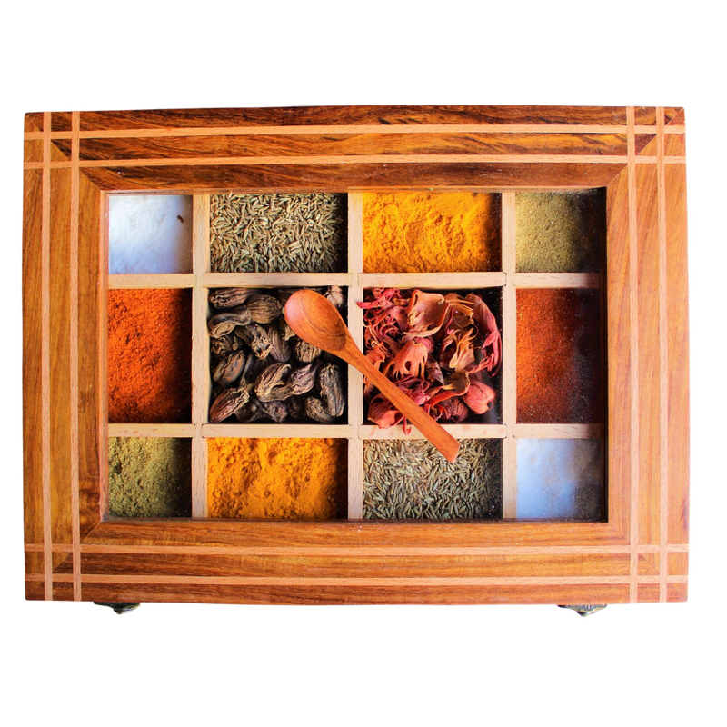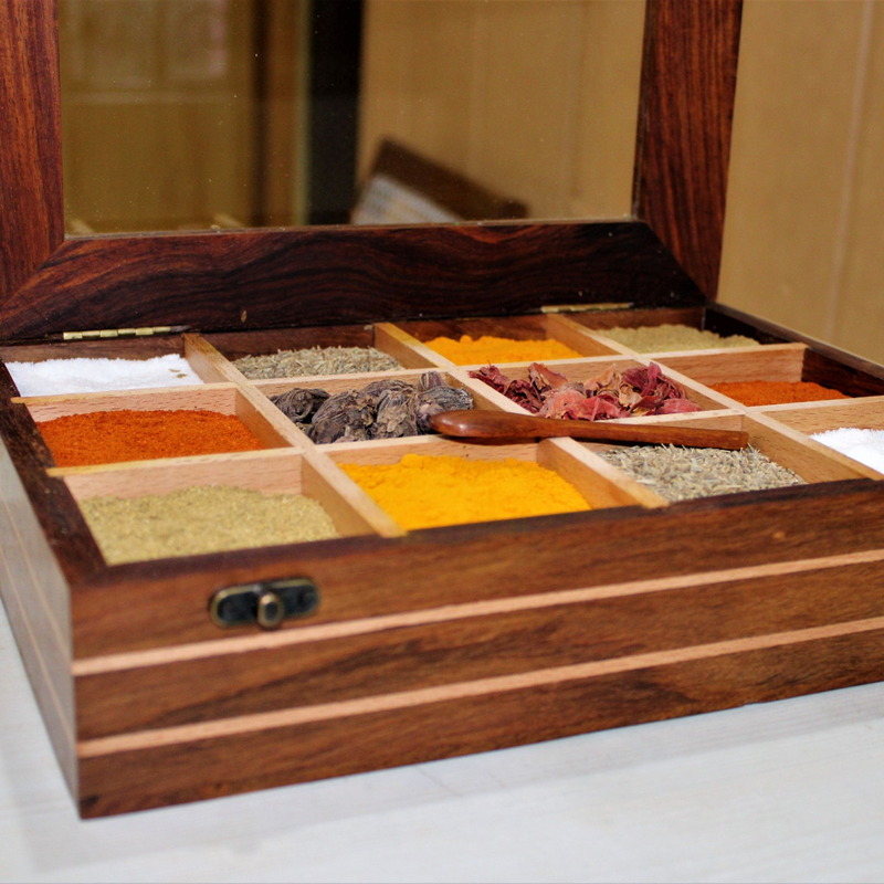 It is a beutifully handcrafted wooden spice box. Has total of 12 partitions. Each partition can hold about 50-80 grams of powdered spices.The box frame is made from mango wood while the partitions are done in Sheesham Wood. Has a glass top.Made In India Product